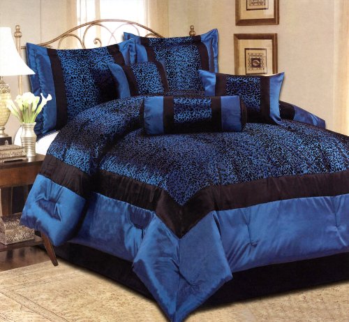 Best Buy 2013 Queen Blue 7 Pcs Flocking Leopard Satin Comforter Set